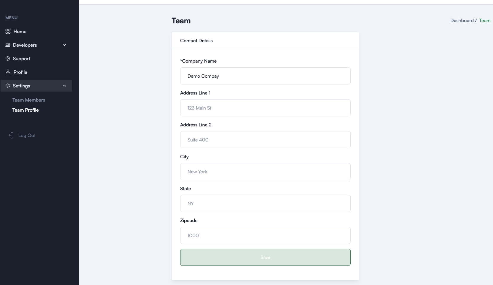 Contains two important sections: 'Team Members' and 'Team Profile.' This is where you'll manage your team, send out invites, and review/update your company information.