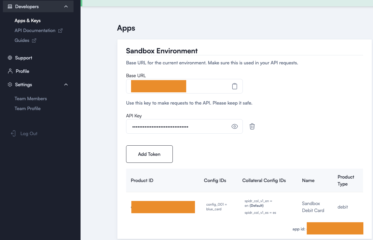 - API key - You can have up to two keys provisioned at once per environment (just hit the 'Add Token' button). You can delete keys as needed for rotation purposes.