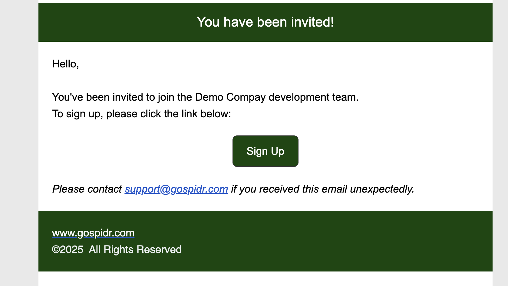 Once a Spidr Dev Portal company owner invites you to their company, you can sign up by clicking the invitation link sent to your email.