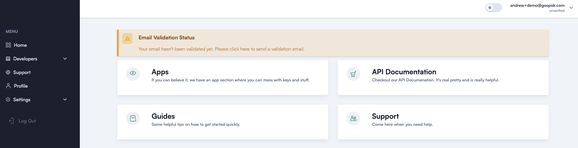 Signing up for the Spidr Dev Portal is the first step in onboarding with Spidr (more information on environments below). The Dev Portal houses your API key and important company/product information.