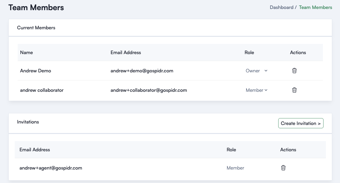 - To invite someone to your team, simply click the 'Create Invitation' button and enter their email. You can delete any pending invites and resend if there are any issues signing up.